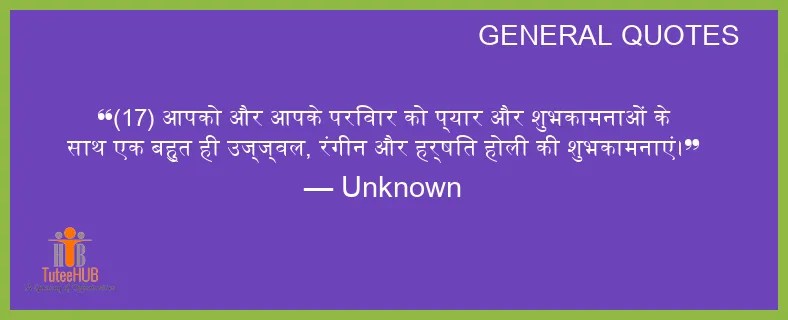 (17) आपको और आपके परिवार को प्यार और शुभकामनाओं के साथ एक बहुत ही उज्ज्वल, रंगीन और हर्षित होली की शुभकामनाएं।