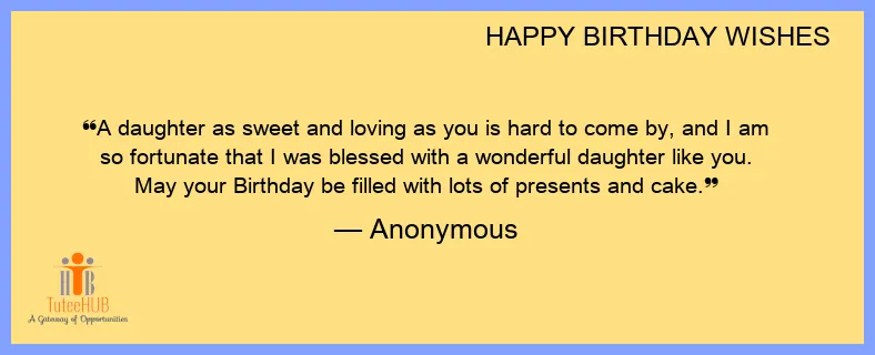 A daughter as sweet and loving as you is hard to come by, and I am so fortunate that I was blessed with a wonderful daughter like you. May your Birthday be filled with lots of presents and cake.