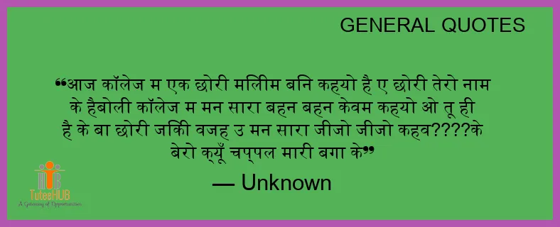 आज कॉलेज म एक छोरी मिलीम बिन कहयो है ए छोरी तेरो नाम के हैबोली कॉलेज म मन सारा बहन बहन केवम कहयो ओ तू ही है के बा छोरी जिंकी वजह उ मन सारा जीजो जीजो कहव????के बेरो क्यूँ चप्पल मारी बगा के