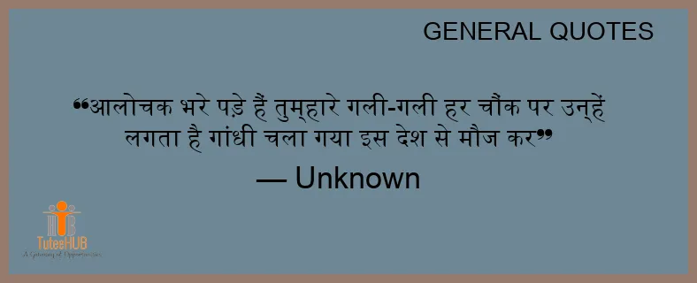 आलोचक भरे पड़े हैं तुम्हारे गली-गली हर चौंक पर उन्हें लगता है गांधी चला गया इस देश से मौज कर