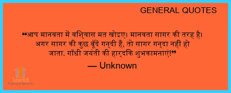 आप मानवता में विश्वास मत खोइए। मानवता सागर की तरह है। अगर सागर की कुछ बूँदें गन्दी हैं, तो सागर गन्दा नहीं हो जाता. गाँधी जयंती की हार्दिक शुभकामनाएं!