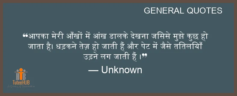 आपका मेरी आँखों में आंख डालके देखना जिससे मुझे कुछ हो जाता है। धड़कने तेज़ हो जाती हैं और पेट में जैसे तितलियाँ उड़ने लग जाती हैं ।
