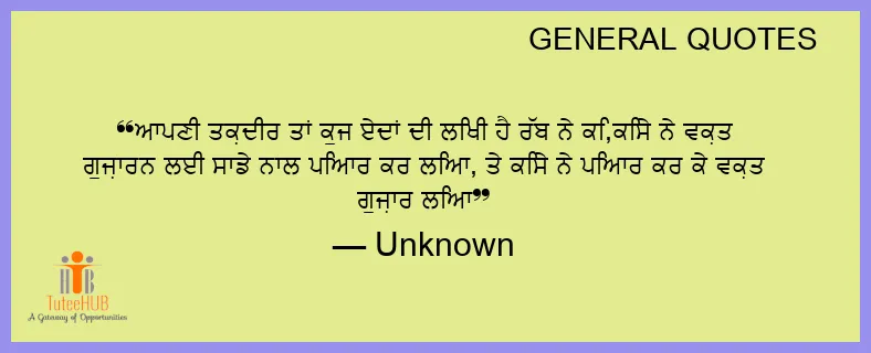 ਆਪਣੀ ਤਕ਼ਦੀਰ ਤਾਂ ਕੁਜ ਏਦਾਂ ਦੀ ਲਿਖੀ ਹੈ ਰੱਬ ਨੇ ਕਿ,ਕਿਸੇ ਨੇ ਵਕ਼ਤ ਗੁਜ਼ਾਰਨ ਲਈ ਸਾਡੇ ਨਾਲ ਪਿਆਰ ਕਰ ਲਿਆ, ਤੇ ਕਿਸੇ ਨੇ ਪਿਆਰ ਕਰ ਕੇ ਵਕ਼ਤ ਗੁਜ਼ਾਰ ਲਿਆ