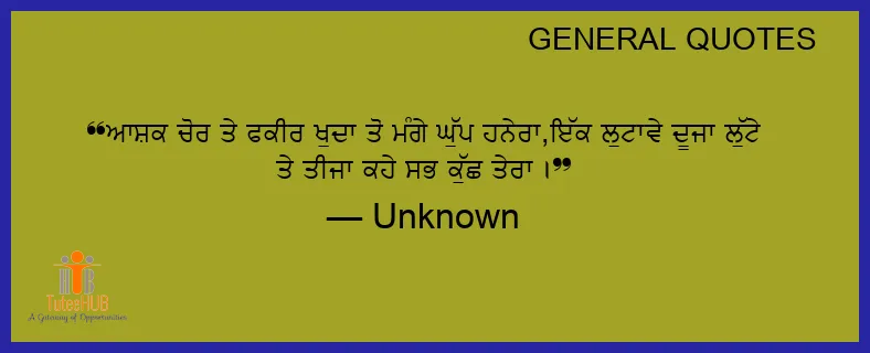 ਆਸ਼ਕ ਚੋਰ ਤੇ ਫਕੀਰ ਖੁਦਾ ਤੋਂ ਮੰਗੇ ਘੁੱਪ ਹਨੇਰਾ,ਇੱਕ ਲੁਟਾਵੇ ਦੂਜਾ ਲੁੱਟੇ ਤੇ ਤੀਜਾ ਕਹੇ ਸਭ ਕੁੱਛ ਤੇਰਾ ।