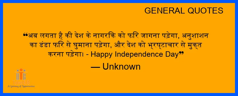 अब लगता है की देश के नागरिक को फिर जागना पड़ेगा, अनुशाशन का डंडा फिर से घुमाना पड़ेगा, और देश को भ्रष्टाचार से मुक्त करना पड़ेगा। - HAPPY Independence Day