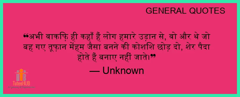 अभी वाकिफ़ ही कहाँ हैं लोग हमारे उड़ान से, वो और थे जो बह गए तूफ़ान मेंहम जैसा बनने की कोशिश छोड़ दो, शेर पैदा होते हैं बनाए नहीं जाते।