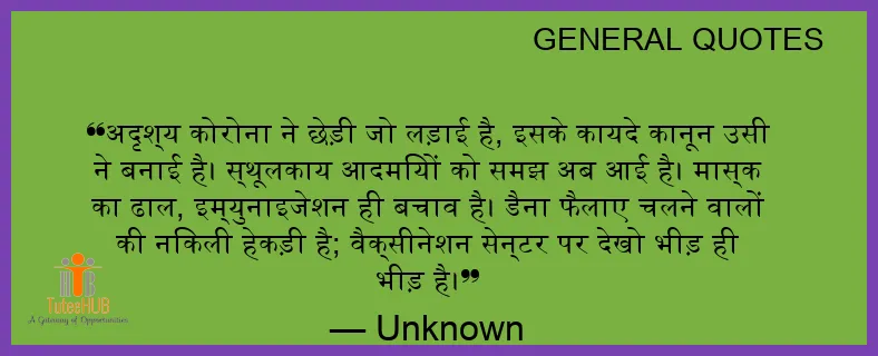 अदृश्य कोरोना ने छेड़ी जो लड़ाई है, इसके कायदे कानून उसी ने बनाई है। स्थूलकाय आदमियों को समझ अब आई है। मास्क का ढाल, इम्युनाइजेशन ही बचाव है। डैना फैलाए चलने वालों की निकली हेकड़ी है; वैक्सीनेशन सेन्टर पर देखो भीड़ ही भीड़ है।