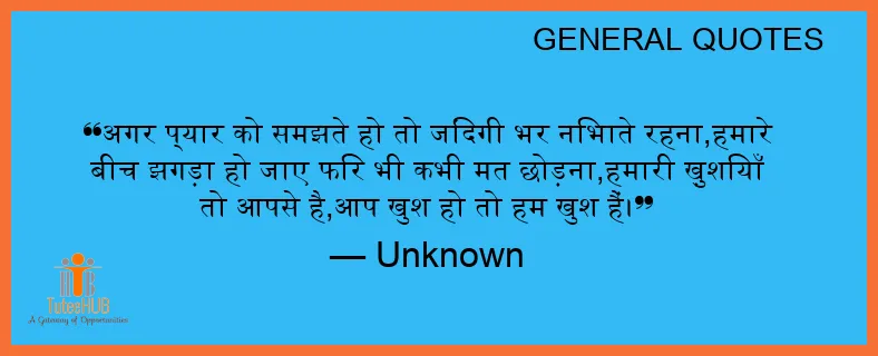 अगर प्यार को समझते हो तो जिंदगी भर निभाते रहना,हमारे बीच झगड़ा हो जाए फिर भी कभी मत छोड़ना,हमारी ख़ुशियाँ तो आपसे है,आप खुश हो तो हम खुश हैं।
