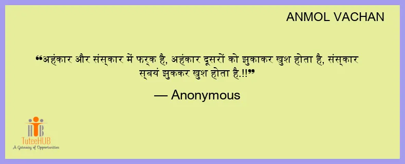 अहंकार और संस्कार में फर्क है, अहंकार दूसरों को झुकाकर खुश होता है, संस्कार स्वयं झुककर खुश होता है.!!