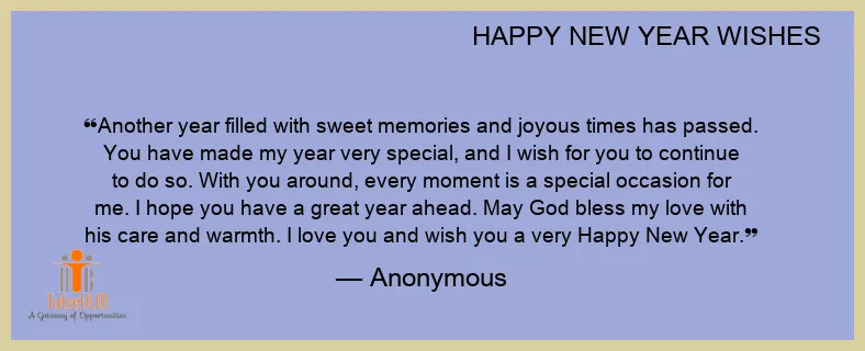 Another year filled with sweet memories and joyous times has passed. You have made my year very special, and I wish for you to continue to do so. With you around, every moment is a special occasion for me. I hope you have a great year ahead. May God bless my love with his care and warmth. I love you and wish you a very Happy New Year.