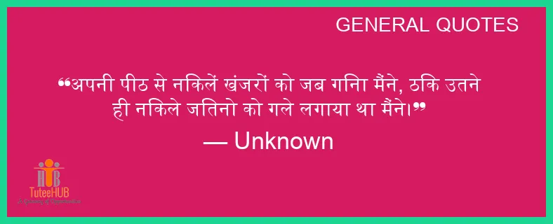 अपनी पीठ से निकलें खंजरों को जब गिना मैंने, ठिक उतने ही निकले जितनो को गले लगाया था मैंने।