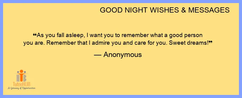 As you fall asleep, I want you to remember what a good person you are. Remember that I admire you and care for you. Sweet dreams!