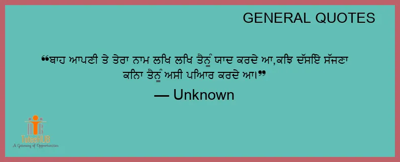 ਬਾਹ ਆਪਣੀ ਤੇ ਤੇਰਾ ਨਾਮ ਲਿਖ ਲਿਖ ਤੈਨੂੰ ਯਾਦ ਕਰਦੇ ਆ,ਕਿੰਝ ਦੱਸਿਏ ਸੱਜਣਾ ਕਿੰਨਾ ਤੈਨੂੰ ਅਸੀਂ ਪਿਆਰ ਕਰਦੇ ਆ।