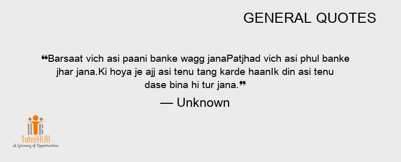 Barsaat vich asi paani banke wagg janaPatjhad vich asi PHUL banke jhar jana.Ki hoya je ajj asi tenu tang karde haanIk DIN asi tenu dase BINA HI tur jana.