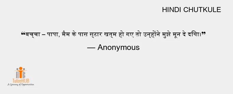 बच्चा – पापा, मैम के पास स्टार खत्म हो गए तो उन्होंने मुझे मून दे दिया।