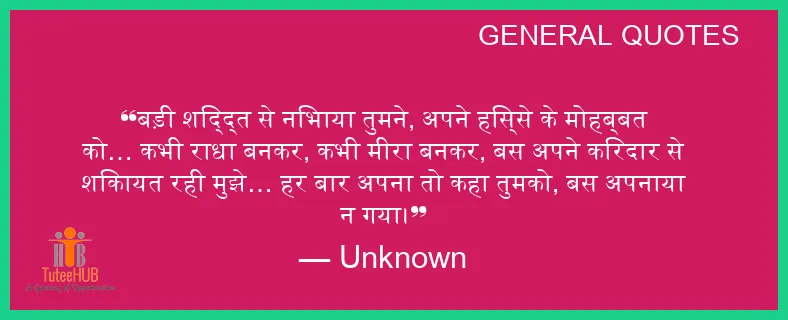 बड़ी शिद्द्त से निभाया तुमने, अपने हिस्से के मोहब्बत को… कभी राधा बनकर, कभी मीरा बनकर, बस अपने किरदार से शिकायत रही मुझे… हर बार अपना तो कहा तुमको, बस अपनाया न गया।