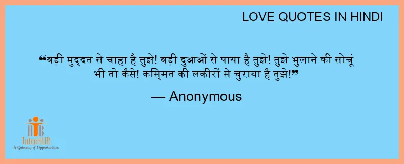 बड़ी मुद्दत से चाहा है तुझे! बड़ी दुआओं से पाया है तुझे! तुझे भुलाने की सोचूं भी तो कैसे! किस्मत की लकीरों से चुराया है तुझे!