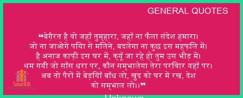 बेग़ैरत है वो जहाँ तुम्हारा, जहाँ ना फैला संदेश हमारा। जो ना जाओगे पिया से मिलने, बदलेगा ना कुछ इस महफ़िल में। है अनाज काफ़ी इस घर में, क्यूँ जा रहे हो तुम उस भीड़ में। थम गयी जो साँस धरा पर, कौन सम्भालेगा तेरा परिवार यहाँ पर। अब तो पैरों में बेड़ियाँ बाँध लो, ख़ुद को घर में रख, देश को सम्भाल लो।।