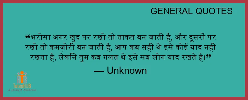 भरोसा अगर खुद पर रखो तो ताकत बन जाती है, और दूसरों पर रखो तो कमज़ोरी बन जाती है, आप कब सही थे इसे कोई याद नही रखता है, लेकिन तुम कब गलत थे इसे सब लोग याद रखते है।