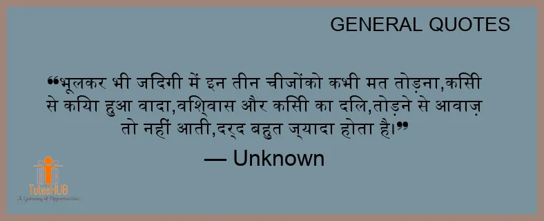 भूलकर भी जिंदगी में इन तीन चीजोंको कभी मत तोड़ना,किसी से किया हुआ वादा,विश्वास और किसी का दिल,तोड़ने से आवाज़ तो नहीं आती,दर्द बहुत ज्यादा होता है।