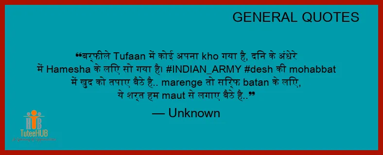 बर्फीले Tufaan में कोई अपना kho गया है, दिन के अंधेरे में Hamesha के लिए सो गया है। #INDIAN_ARMY #desh की mohabbat में खुद को तपाए बैठे है.. marenge तो सिर्फ batan के लिए, ये शर्त हम maut से लगाए बैठे है..