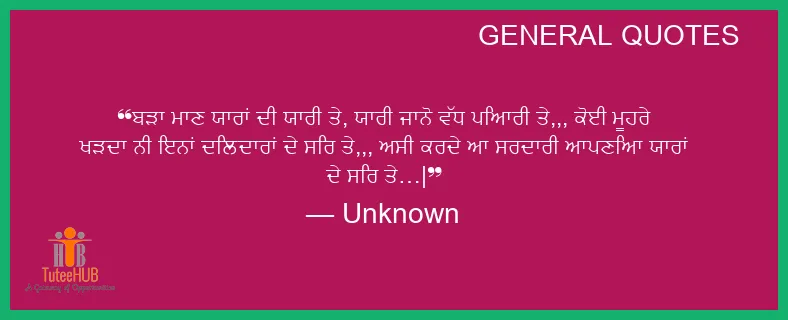 ਬੜਾ ਮਾਣ ਯਾਰਾਂ ਦੀ ਯਾਰੀ ਤੇ, ਯਾਰੀ ਜਾਨੋ ਵੱਧ ਪਿਆਰੀ ਤੇ,,, ਕੋਈ ਮੂਹਰੇ ਖੜਦਾ ਨੀ ਇਨਾਂ ਦਿਲਦਾਰਾਂ ਦੇ ਸਿਰ ਤੇ,,, ਅਸੀ ਕਰਦੇ ਆ ਸਰਦਾਰੀ ਆਪਣਿਆ ਯਾਰਾਂ ਦੇ ਸਿਰ ਤੇ…|