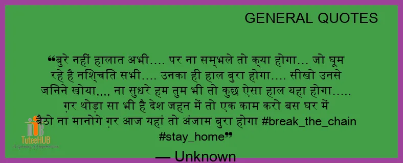 बुरे नहीं हालात अभी…. पर ना सम्भले तो क्या होगा… जो घूम रहे है निश्चिंत सभी…. उनका ही हाल बुरा होगा…. सीखो उनसे जिनने खोया,,,, ना सुधरे हम तुम भी तो कुछ ऐसा हाल यहा होगा….. ग़र थोड़ा सा भी है देश जहन में तो एक काम करो बस घर में बैठो ना मानोगे ग़र आज यहां तो अंजाम बुरा होगा #break_the_chain #stay_home