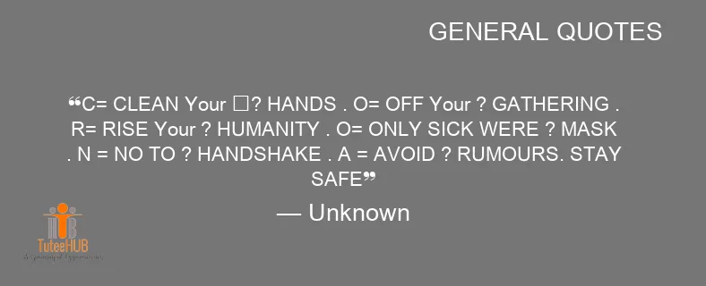 C= CLEAN Your ✋? HANDS . O= OFF Your ? GATHERING . R= RISE Your ? HUMANITY . O= ONLY SICK WERE ? MASK . N = NO TO ? HANDSHAKE . A = AVOID ? RUMOURS. STAY SAFE