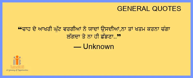 ਚਾਹ ਦੇ ਆਖਰੀ ਘੁੱਟ ਵਰਗੀਆਂ ਨੇ ਯਾਦਾਂ ਉੁਸਦੀਆਂ,ਨਾ ਤਾਂ ਖਤਮ ਕਰਨਾ ਚੰਗਾ ਲੱਗਦਾ ਤੇ ਨਾ ਹੀ ਛੱਡਣਾ..