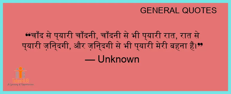 चाँद से प्यारी चाँदनी, चाँदनी से भी प्यारी रात, रात से प्यारी ज़िन्दगी, और ज़िन्दगी से भी प्यारी मेरी बहना हैं।