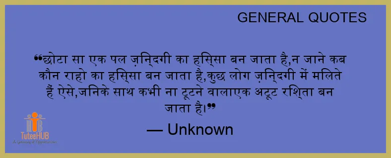 छोटा सा एक पल ज़िन्दगी का हिस्सा बन जाता है,न जाने कब कौन राहो का हिस्सा बन जाता है,कुछ लोग ज़िन्दगी में मिलते हैं ऐसे,जिनके साथ कभी ना टूटने वालाएक अटूट रिश्ता बन जाता है।