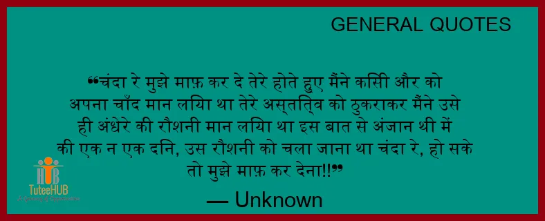 चंदा रे मुझे माफ़ कर दे तेरे होते हुए मैंने किसी और को अपना चाँद मान लिया था तेरे अस्तित्व को ठुकराकर मैंने उसे ही अंधेरे की रौशनी मान लिया था इस बात से अंजान थी में की एक न एक दिन, उस रौशनी को चला जाना था चंदा रे, हो सके तो मुझे माफ़ कर देना!!