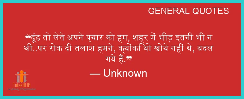 ढूंढ तो लेते अपने प्यार को हम, शहर में भीड़ इतनी भी न थी..पर रोक दी तलाश हमने, क्योंकि वो खोये नहीं थे, बदल गये हैं.