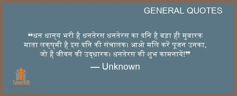 धन धान्य भरी है धनतेरस धनतेरस का दिन है बड़ा ही मुबारक माता लक्ष्मी है इस दिन की संचालक। आओ मिल करें पूजन उनका, जो हैं जीवन की उद्धारक। धनतेरस की शुभ कामनायें!