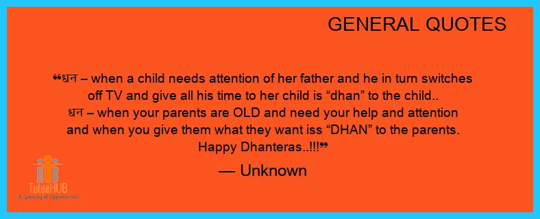 धन – when a child needs attention of her FATHER and he in turn switches off TV and give all his TIME to her child is “dhan” to the child.. धन – when your parents are OLD and need your help and attention and when you give them what they want ISS “DHAN” to the parents. Happy Dhanteras..!!!