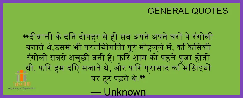 दीवाली के दिन दोपहर से ही सब अपने अपने घरों पे रंगोली बनाते थे,उसमे भी प्रतियोगिता पूरे मोहल्ले में, कि किसकी रंगोली सबसे अच्छी बनी है। फिर शाम को पहले पूजा होती थी, फिर हम दिए सजाते थे, और फिर प्रासाद कि मिठाइयों पर टूट पड़ते थे।