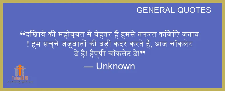 दिखावे की महोब्बत से बेहतर हैं हमसे नफरत किजिए जनाब ! हम सच्चे जज़्बातों की बड़ी कदर करते हैं, आज चॉकलेट डे है! हैप्पी चॉकलेट डे!