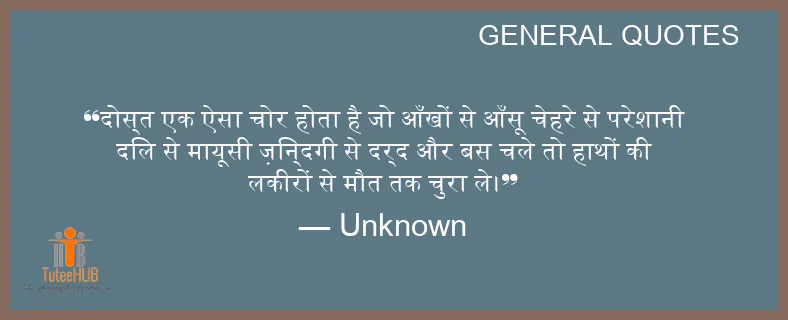 दोस्त एक ऐसा चोर होता है जो आँखों से आँसू चेहरे से परेशानी दिल से मायूसी ज़िन्दगी से दर्द और बस चले तो हाथों की लकीरों से मौत तक चुरा ले।