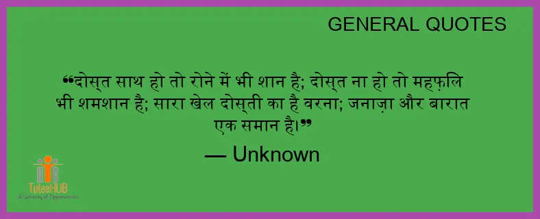 दोस्त साथ हो तो रोने में भी शान है; दोस्त ना हो तो महफ़िल भी शमशान है; सारा खेल दोस्ती का है वरना; जनाज़ा और बारात एक समान है।