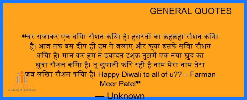 दर सजाकर एक दिया रौशन किया है। हसरतों का क़हक़हा रौशन किया है। आज तक बस दीप ही हम ने जलाए और क्या इसके सिवा रौशन किया है। मान कर हम ने इबादत इश्क़ तुझमें एक नया ख़ुद का ख़ुदा रौशन किया है। तू छुपाती फिर रही है नाम मेरा नाम तेरा जब लिखा रौशन किया है। Happy Diwali to all of u?? – Farman Meer PATEL