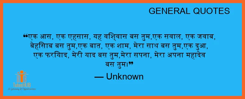 एक आस, एक एहसास, यह विश्वास बस तुम,एक सवाल,​ एक जवाब, बेहिसाब बस तुम,एक बात, एक शाम, मेरा साथ बस तुम,एक दुआ, एक फरियाद, मेरी याद बस तुम,मेरा सपना, मेरा अपना महादेव बस तुम।