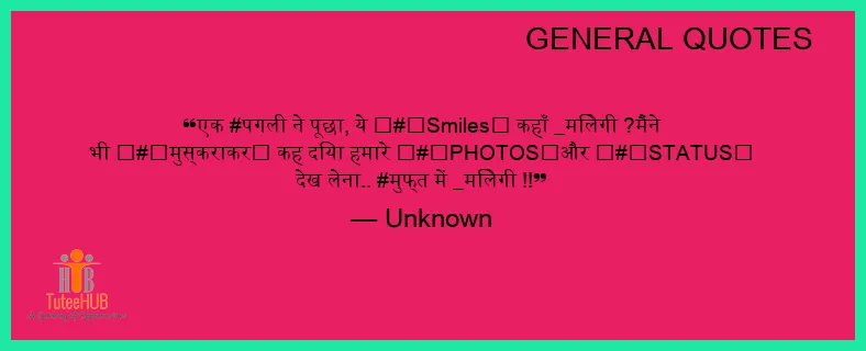एक #पगली ने पूछा, ये ‪#‎Smiles‬ कहाँ _मिलेगी ?मैंने भी ‪#‎मुस्कराकर‬ कह दिया हमारे ‪#‎PHOTOS‬और ‪#‎STATUS‬ देख लेना.. #मुफ्त में _मिलेगी !!