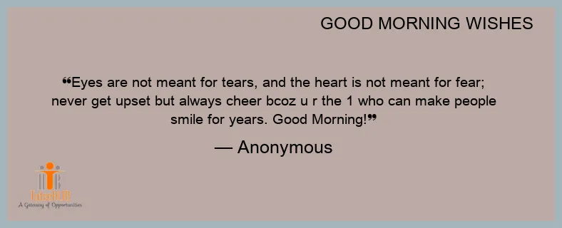 Eyes are not meant for tears, and the heart is not meant for fear; never get upset but always cheer bcoz u r the 1 who can make people smile for years. Good Morning!