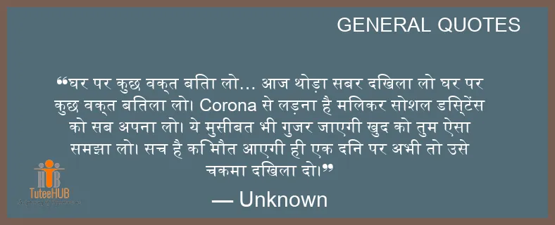घर पर कुछ वक्त बिता लो… आज थोड़ा सबर दिखला लो घर पर कुछ वक्त बितला लो। Corona से लड़ना है मिलकर सोशल डिस्टेंस को सब अपना लो। ये मुसीबत भी गुजर जाएगी खुद को तुम ऐसा समझा लो। सच है कि मौत आएगी ही एक दिन पर अभी तो उसे चकमा दिखला दो।