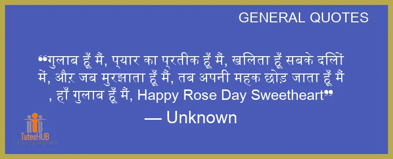 गुलाब हूँ मैं, प्यार का प्रतीक हूँ मैं, खिलता हूँ सबके दिलों में, औऱ जब मुरझाता हूँ मैं, तब अपनी महक छोड़ जाता हूँ मैं , हाँ गुलाब हूँ मैं, Happy Rose Day SWEETHEART