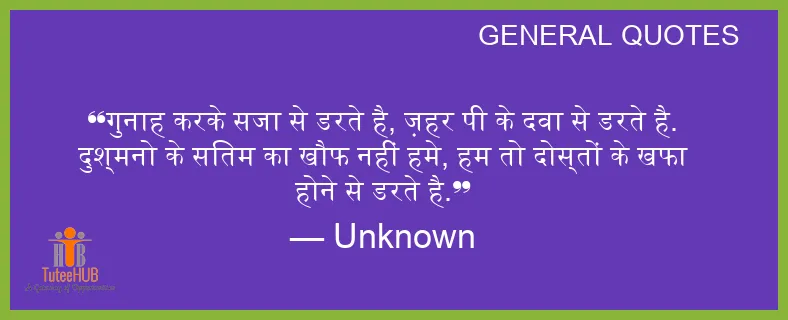 गुनाह करके सजा से डरते है, ज़हर पी के दवा से डरते है. दुश्मनो के सितम का खौफ नहीं हमे, हम तो दोस्तों के खफा होने से डरते है.