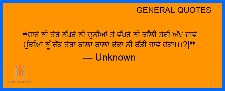 ਹਾਏ ਨੀਂ ਤੇਰੇ ਨੱਖਰੇ ਨੀਂ ਦੁਨੀਆਂ ਤੋਂ ਵੱਖਰੇ ਨੀਂ ਬਿੱਲੀ ਤੇਰੀ ਅੱਖ ਜਾਵੇ ਮੁੰਡਿਆਂ ਨੂੰ ਚੱਕ ਤੇਰਾ ਕਾਲਾ ਕਾਲਾ ਕੋਕਾ ਨੀਂ ਕੱਡੀ ਜਾਵੇ ਹੋਕਾ।।।?|