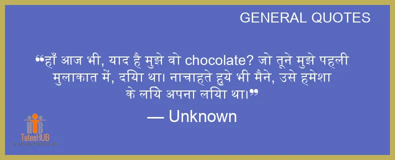 हाँ आज भी, याद है मुझे वो CHOCOLATE? जो तूने मुझे पहली मुलाकात में, दिया था। नाचाहते हुये भी मैने, उसे हमेशा के लिये अपना लिया था।