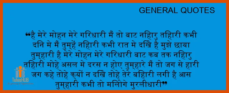 है मेरे मोहन मेरे गिरधारी मैं तो बाट निहारु तिहारी कभी दिन मे मैं तुम्हें निहारी कभी रात मे दिखे है मुझे छाया तुम्हारी है मेरे मोहन मेरे गिरधारी बाट कब तक निहारु तिहारी मोहे असल मे दरस न होए तुम्हारे मैं तो जग से हारी जग कहे तोहे क्यों न दिखे तोहे तेरे बिहारी लगी है आस तुम्हारी कभी तो मिलोगे मुरलीधारी