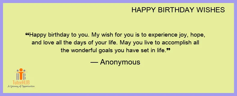 Happy birthday to you. My wish for you is to experience joy, hope, and love all the days of your life. May you live to accomplish all the wonderful goals you have set in life.